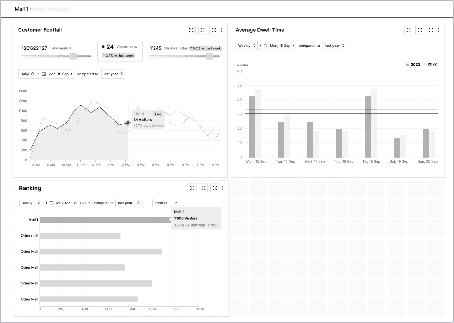 Widgets at the top of the mall manager dashboard display live data for a quick overview without scrolling. A primary graph shows different time periods, allowing managers to track the mall’s performance today and over time.