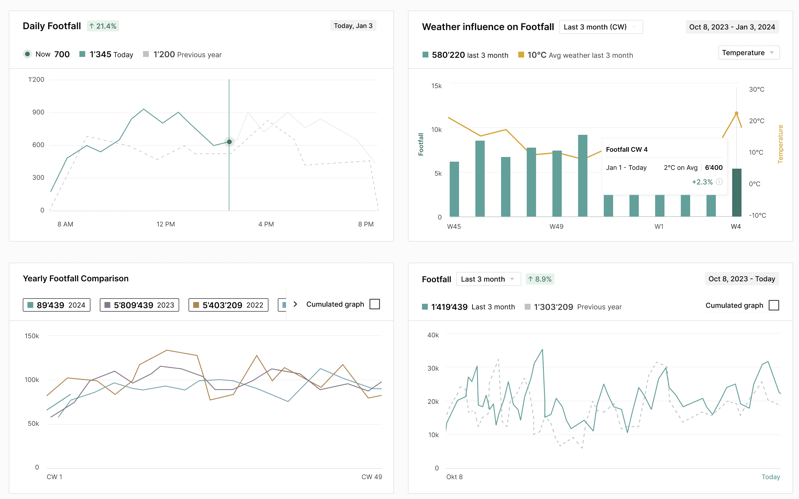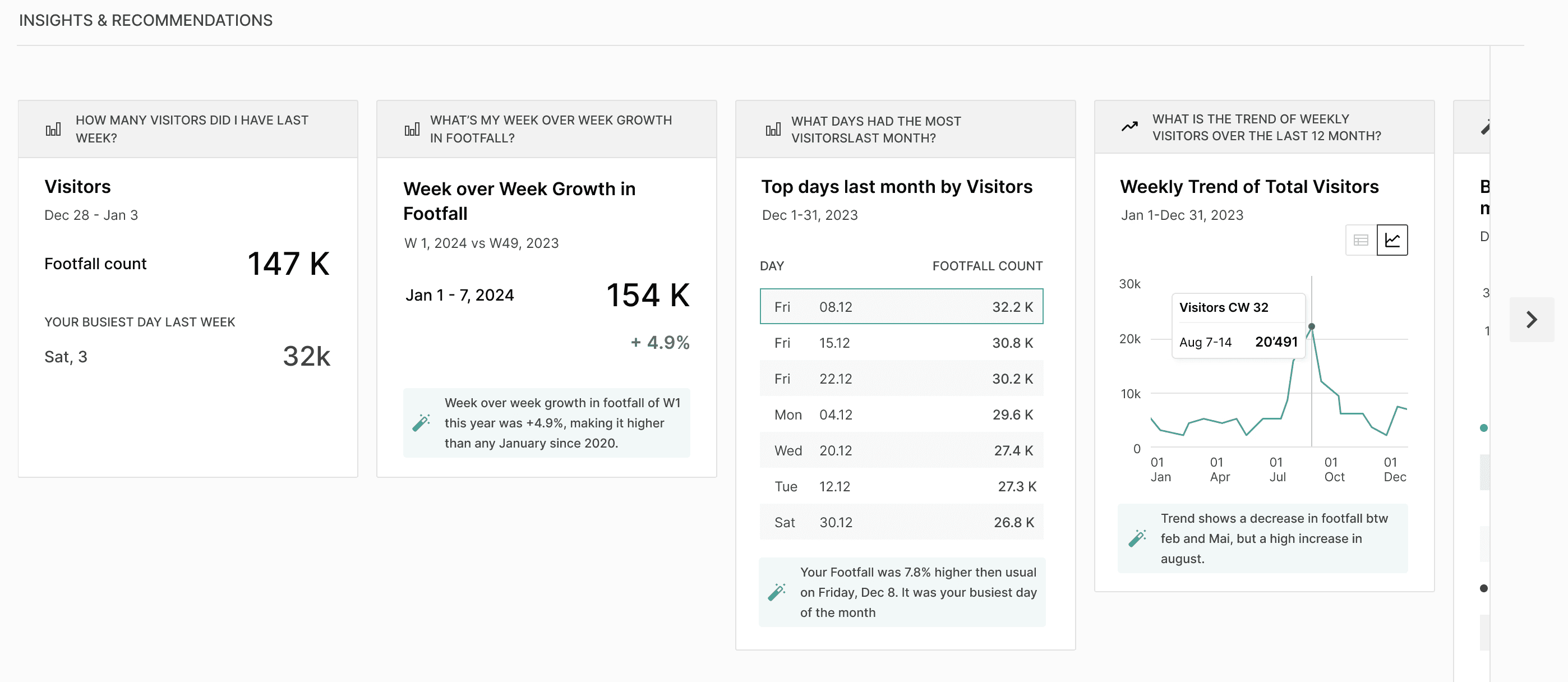 Mall Manager Detail Page: Predictions and insights are displayed at the top for quick access to key metrics, with footfall trends over different time periods to track and compare performance over time.