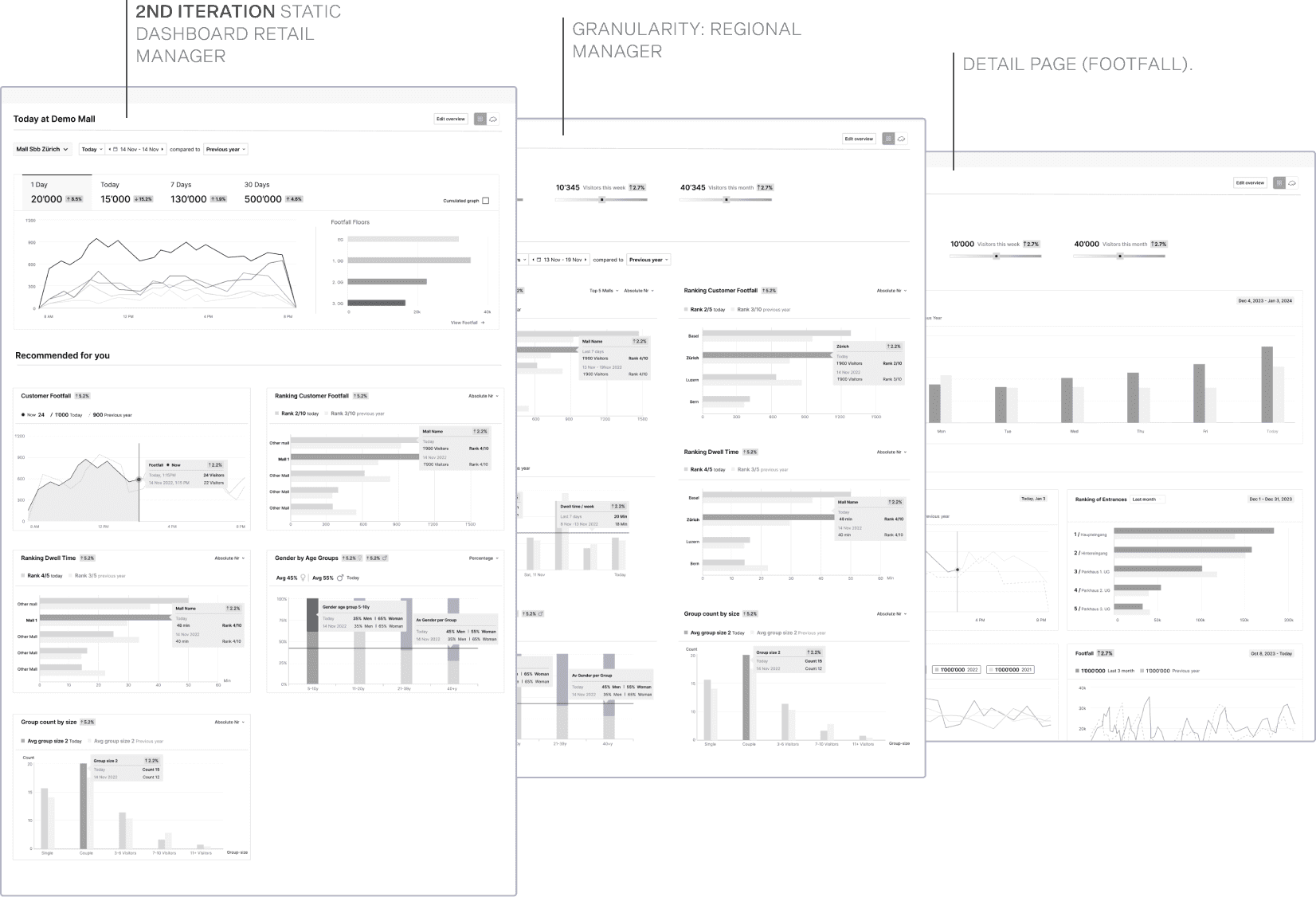 We went through several iterations. The first used a custom grid-view dashboard focused on footfall metrics. The second showed that a static default dashboard works best for novice users, with a primary graph combining datasets for a quick overview. Ranking proved important for managers to compare performance, and finally, we developed insights and analytical recommendations based on trends from our graphs.