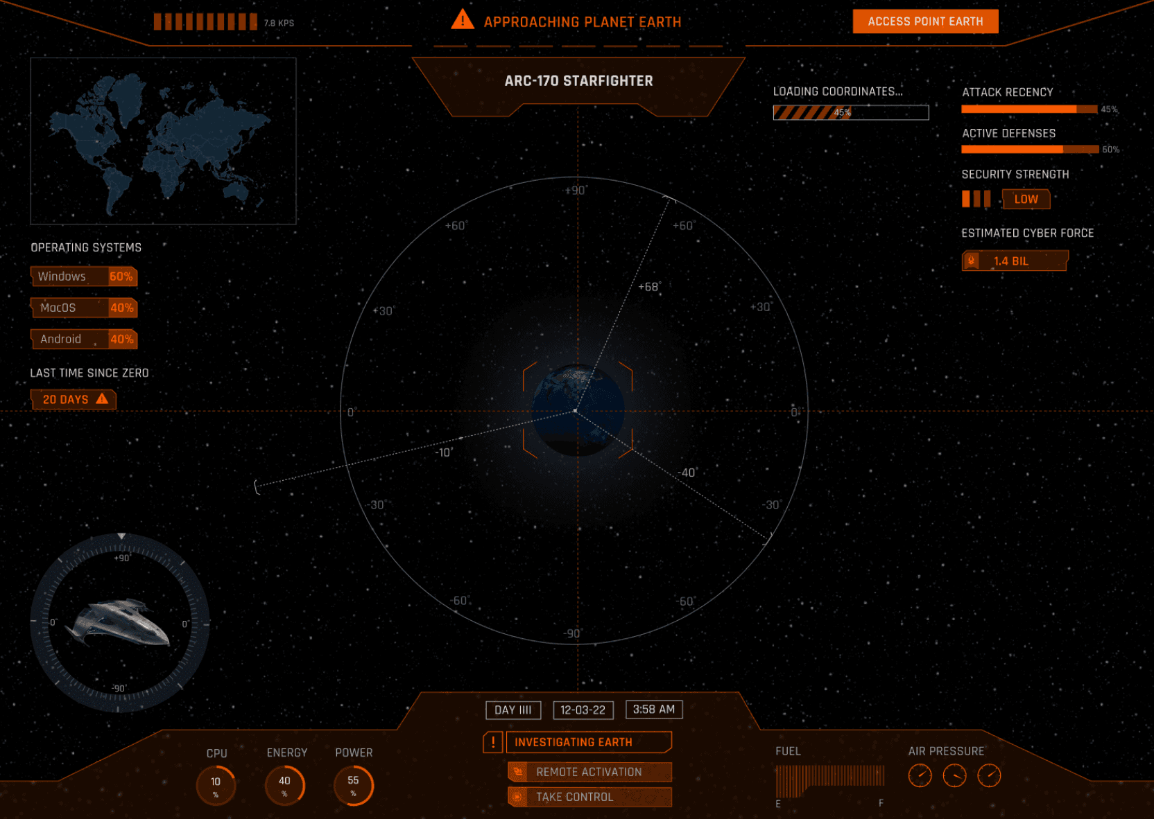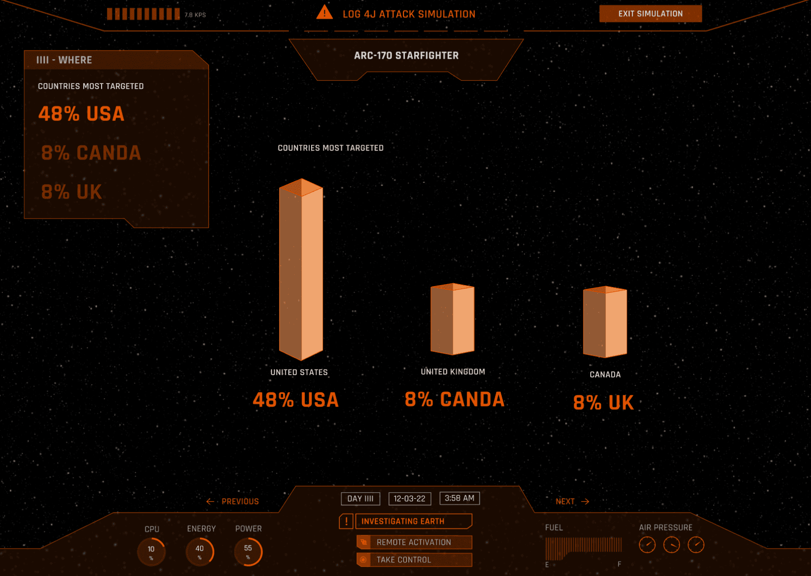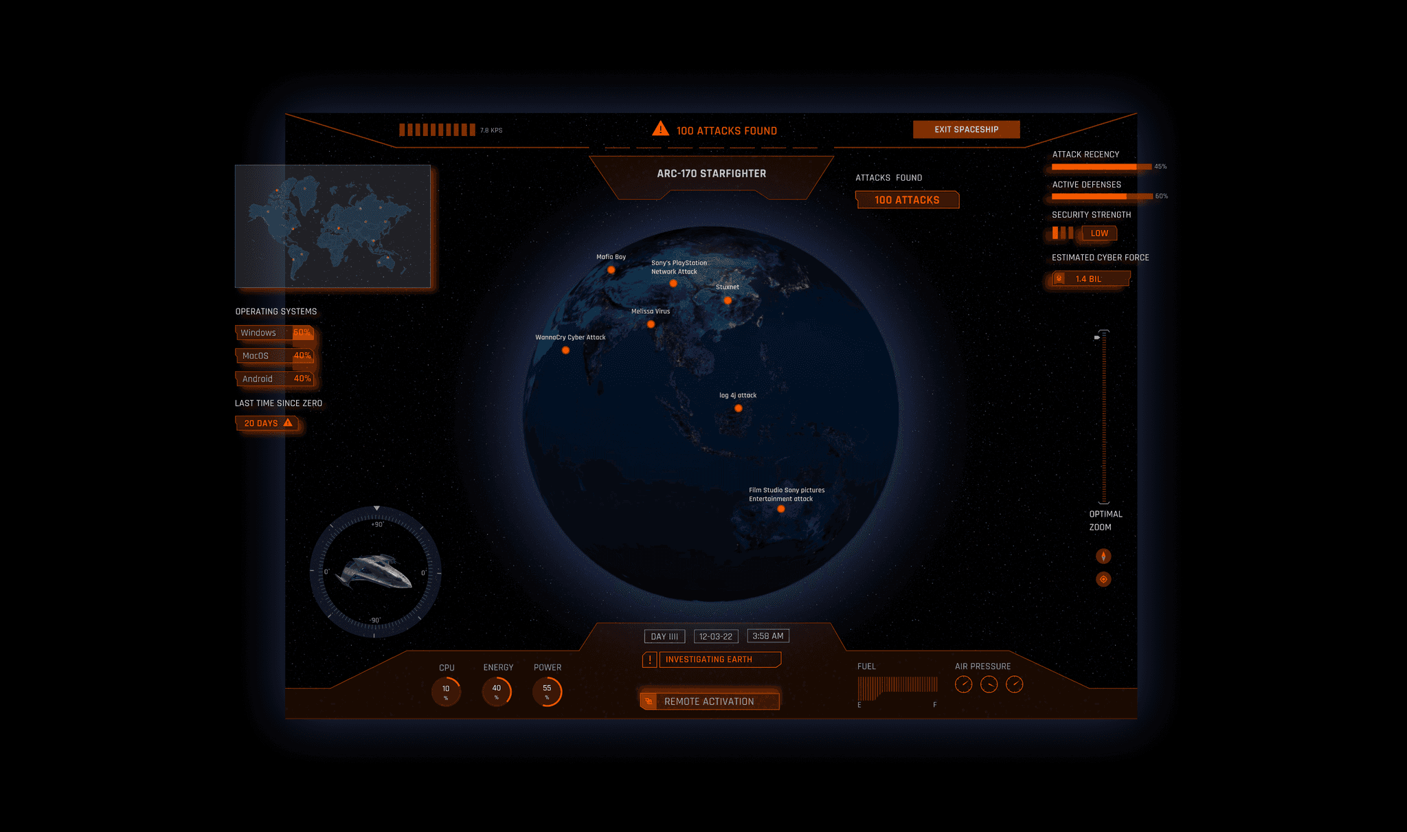 After launching the expedition, users can explore different cyberattacks on Earth by clicking orange attack points. The prototype provides an intuitive interface to navigate and analyze historical attacks, using case studies and interactive visualizations to examine vectors, methods, and mitigation strategies, improving cybersecurity awareness.