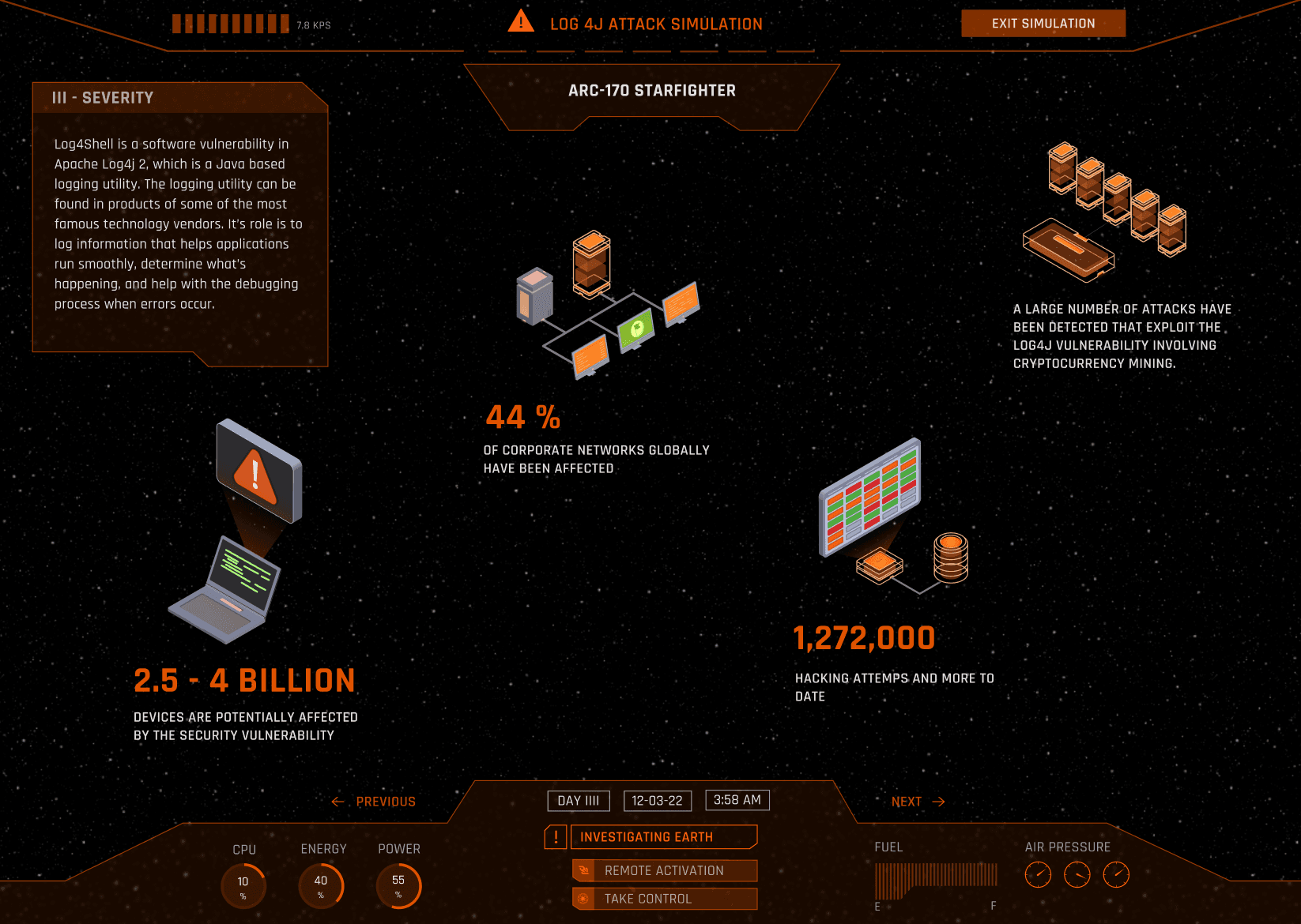 Once an attack is selected, users see key facts and a simulation preview. This example shows the Log4j attack, one of the most severe cyberattacks worldwide. The hands-on approach helps users take a proactive stance and strengthen their digital defenses.