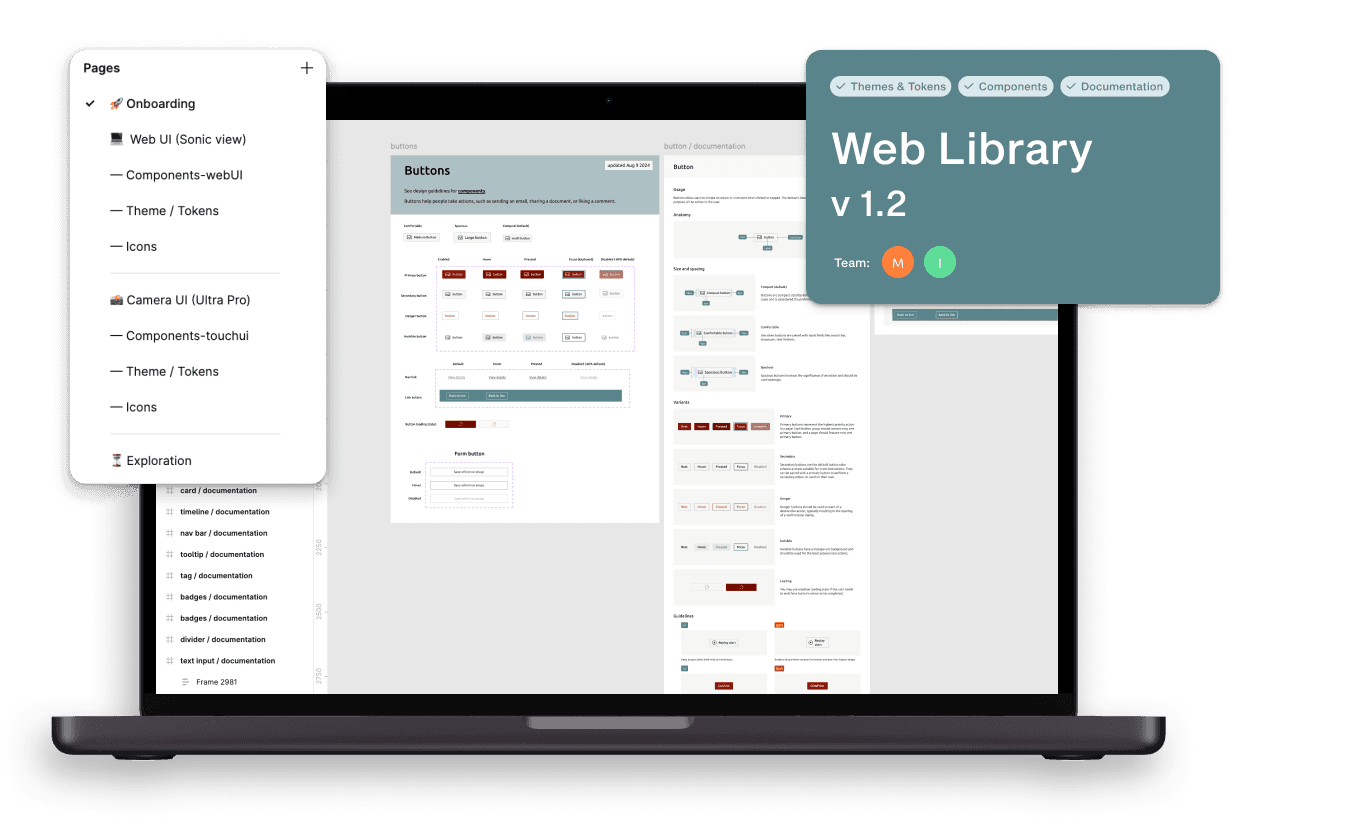 To support adoption of the design system, we created this team structure in Figma: Onboarding for designers and developers with examples and guidelines; workflows for using the design system; product areas with component libraries and use case examples; and an exploration and analysis area for ideas, in-progress designs, and feedback.