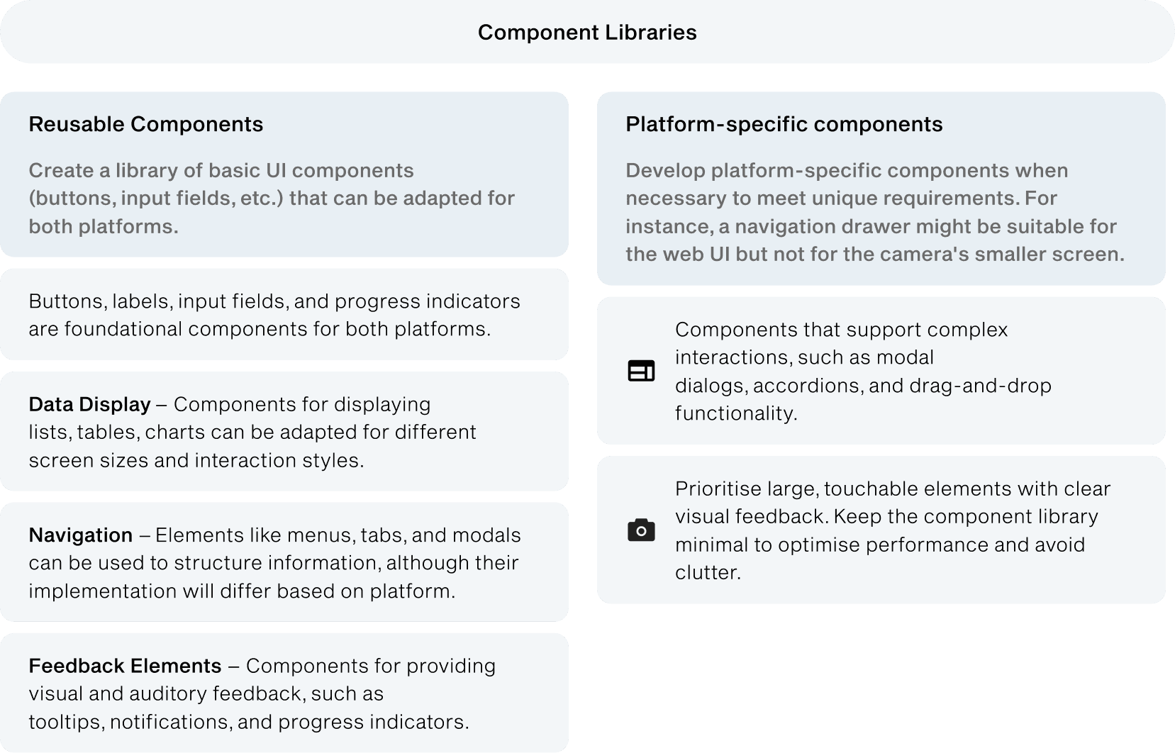 To improve component library usage, we agreed on the following structure: a cover showing platform, version, team, and status; Getting Started guidelines for designers and developers; Theme/tokens with documentation; designed and documented components and patterns with usage tips; and an exploration area for new or in-progress components.