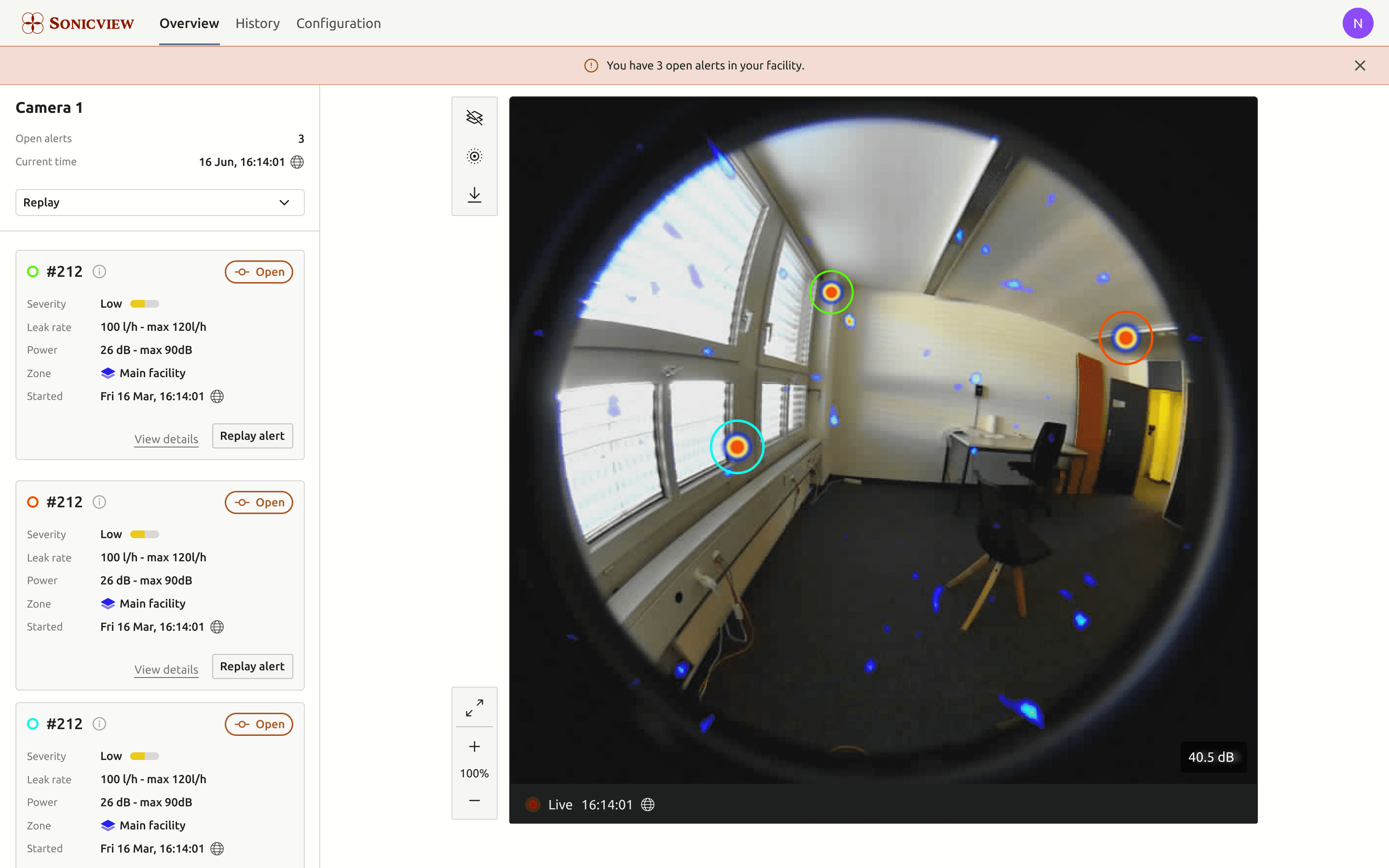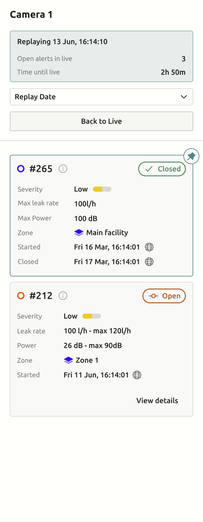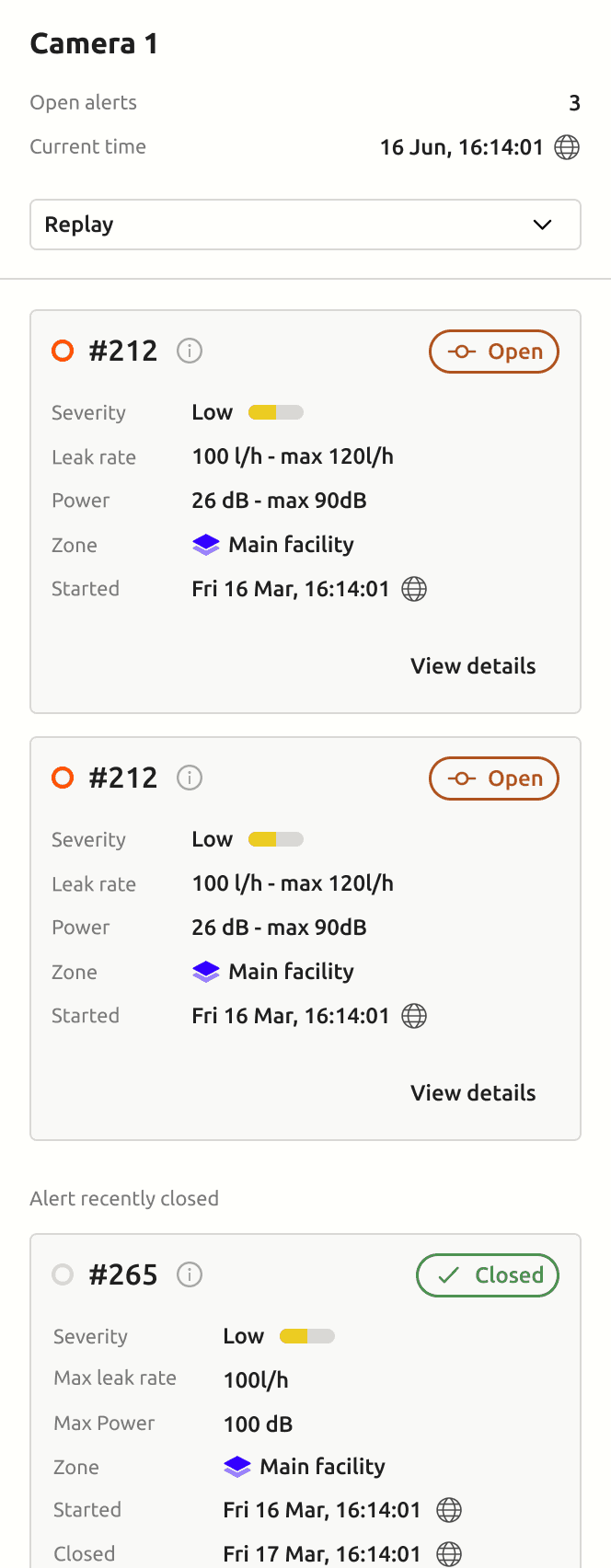 A sliding banner, pulsating sidebar icons, and sound notifications ensure timely awareness of critical events, even in high-distraction environments. Alert replay enables operators to revisit past events in real-time. This allows for an analysis of ongoing and resolved gas leaks.