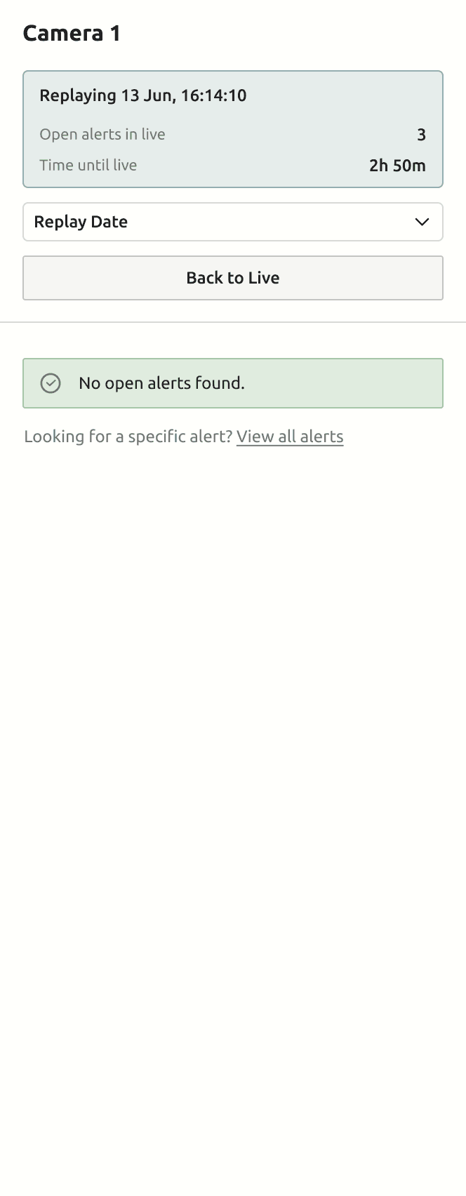 During replay mode, real-time alerts will trigger notifications, prompting users to switch back to live view to address immediate threats.
